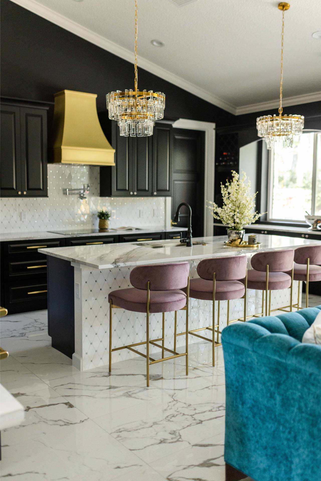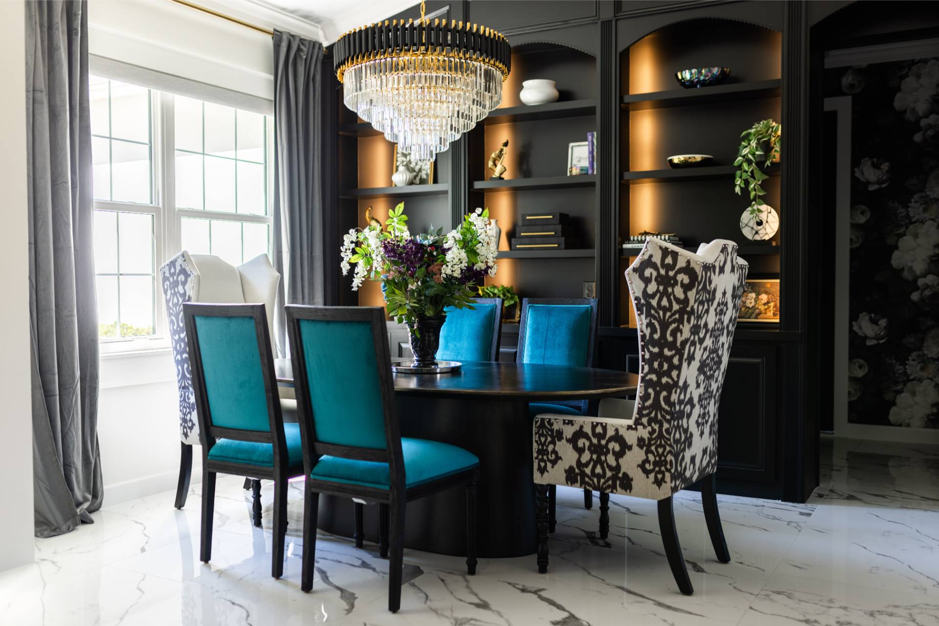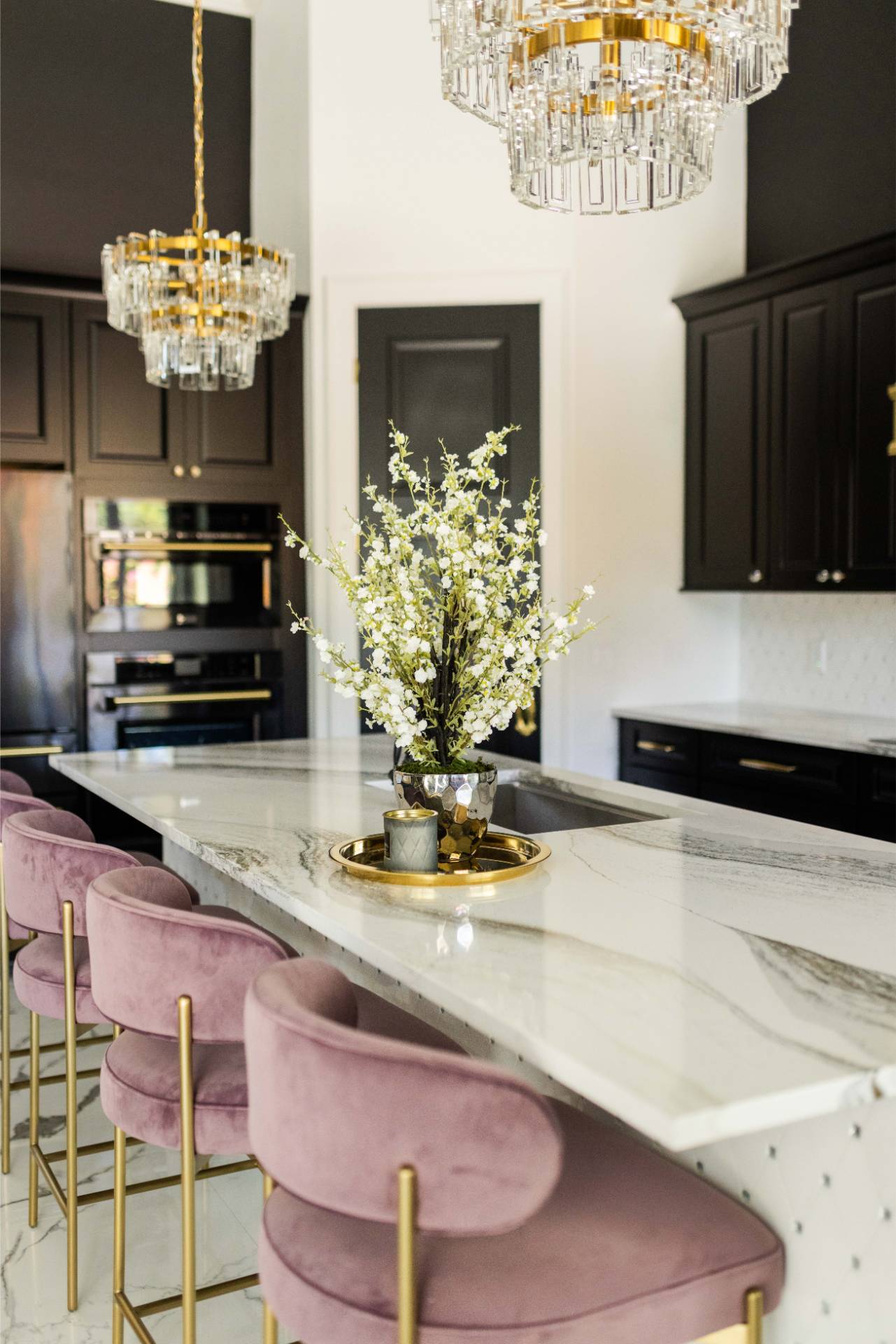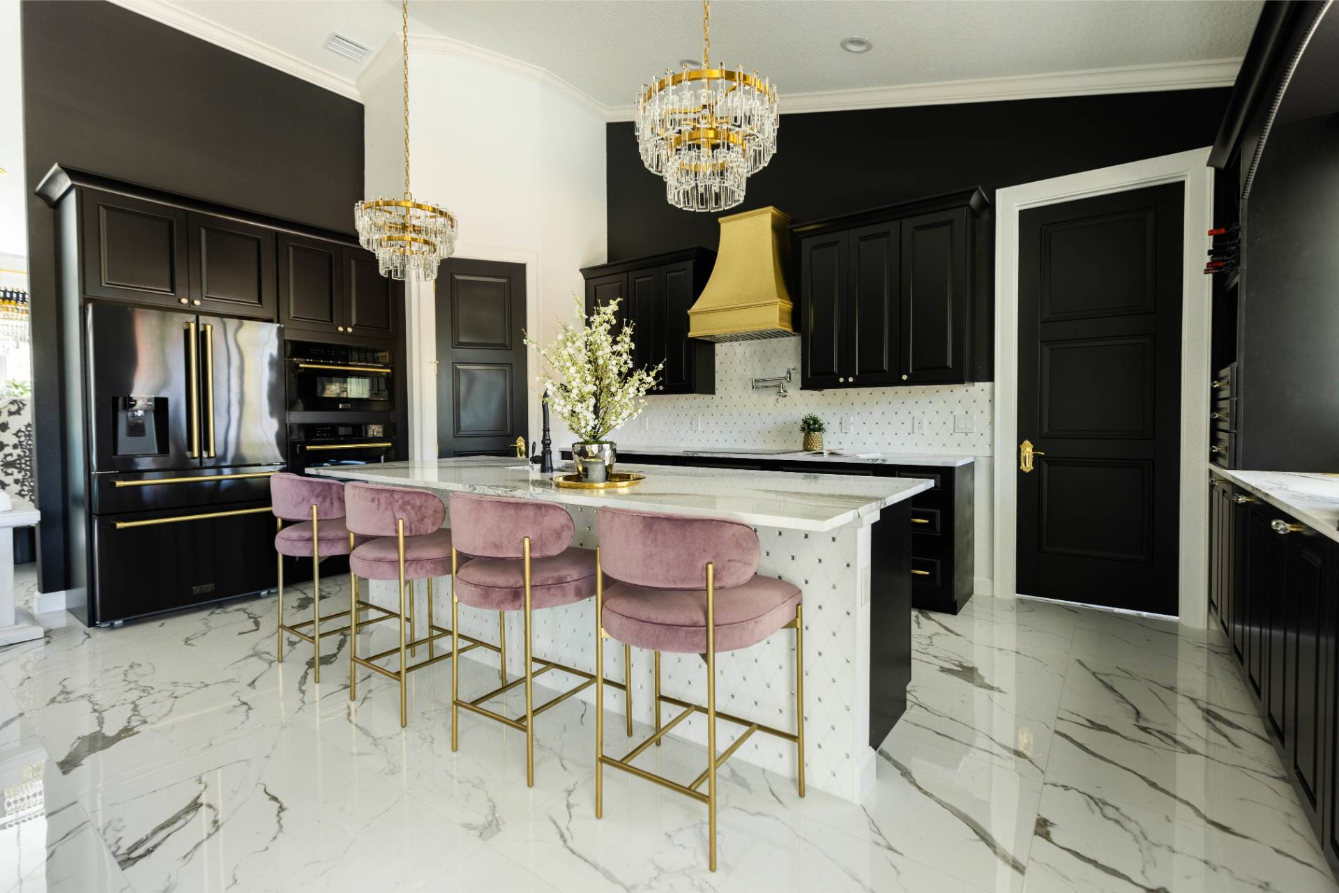 The client’s design vision leaned boldly toward Glam, and the aesthetic shines throughout the home. Think high-gloss finishes, luxe textures, statement lighting, and rich metallic accents—all coming together to create an elevated, sophisticated atmosphere.