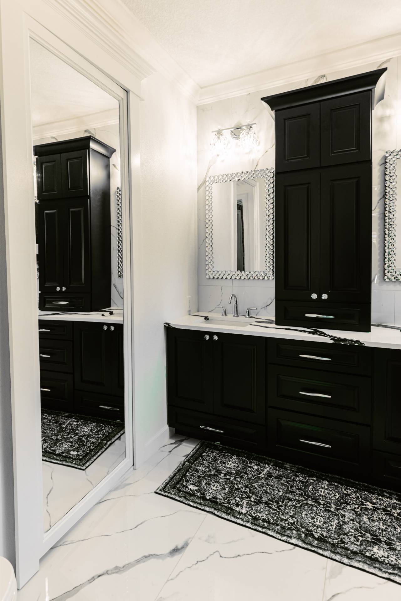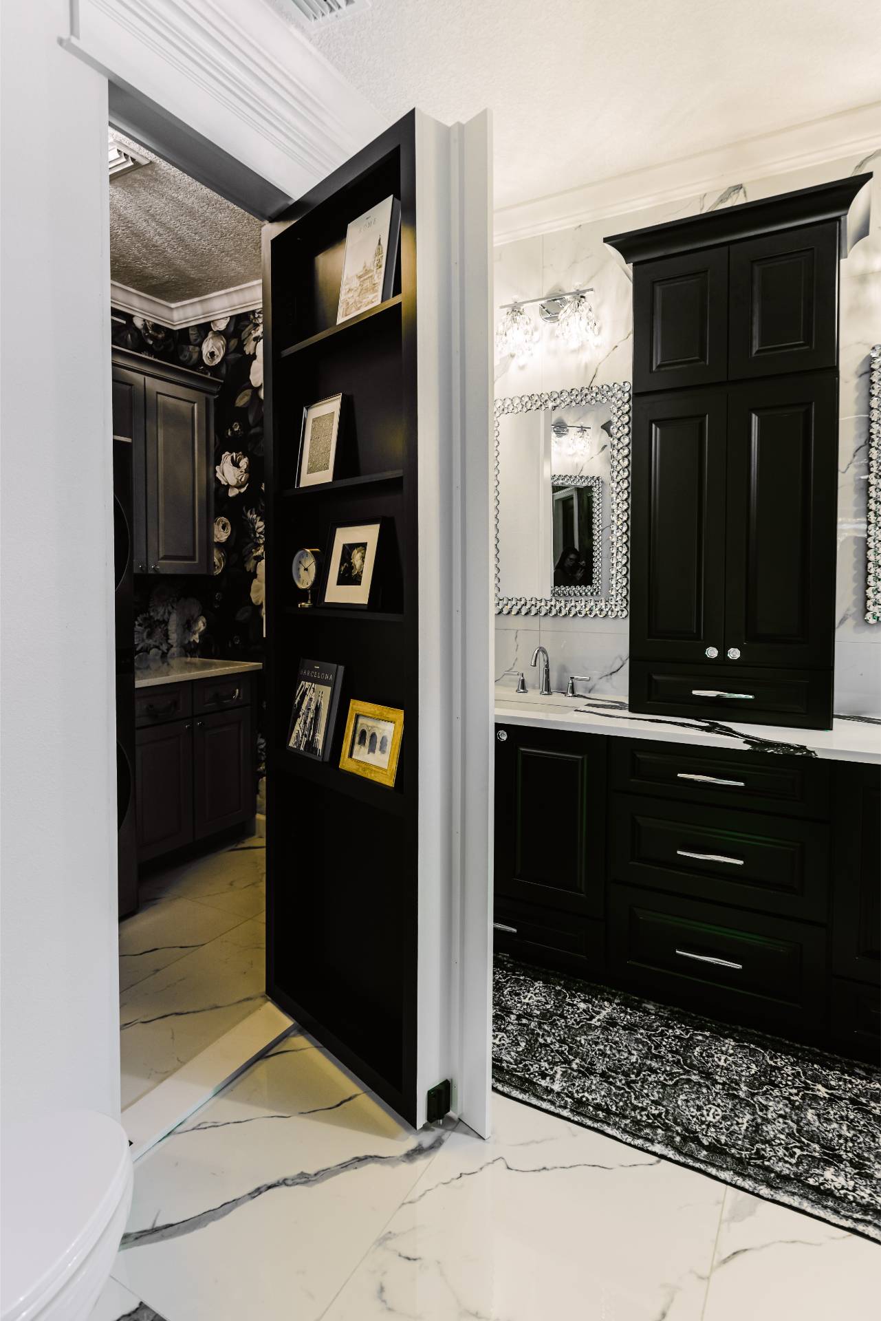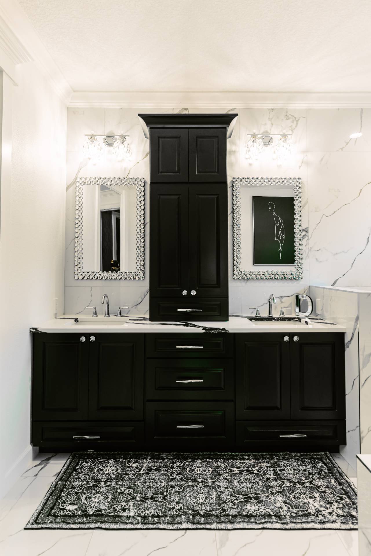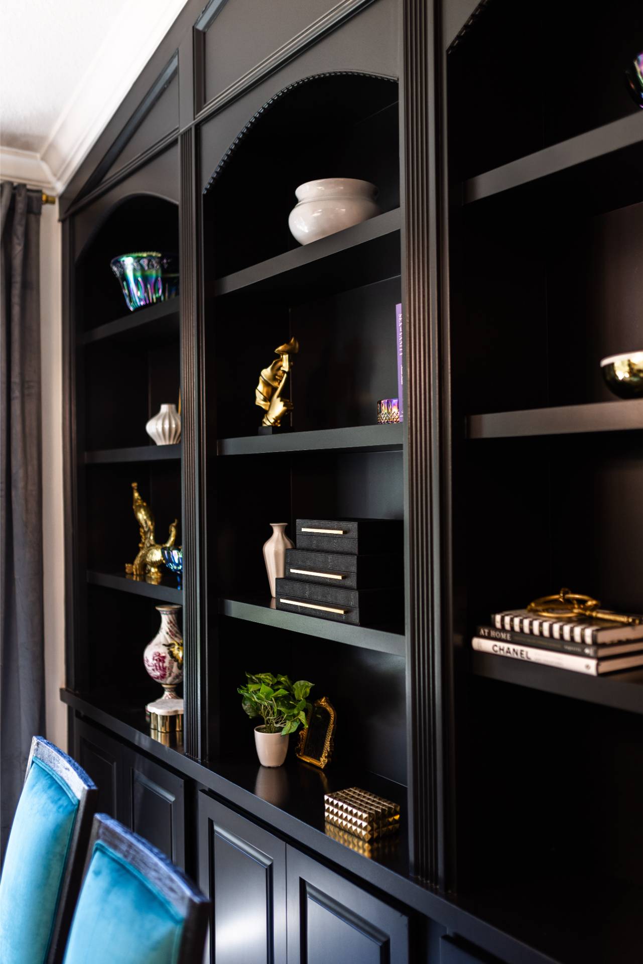 The client’s design vision leaned boldly toward Glam, and the aesthetic shines throughout the home. Think high-gloss finishes, luxe textures, statement lighting, and rich metallic accents—all coming together to create an elevated, sophisticated atmosphere.