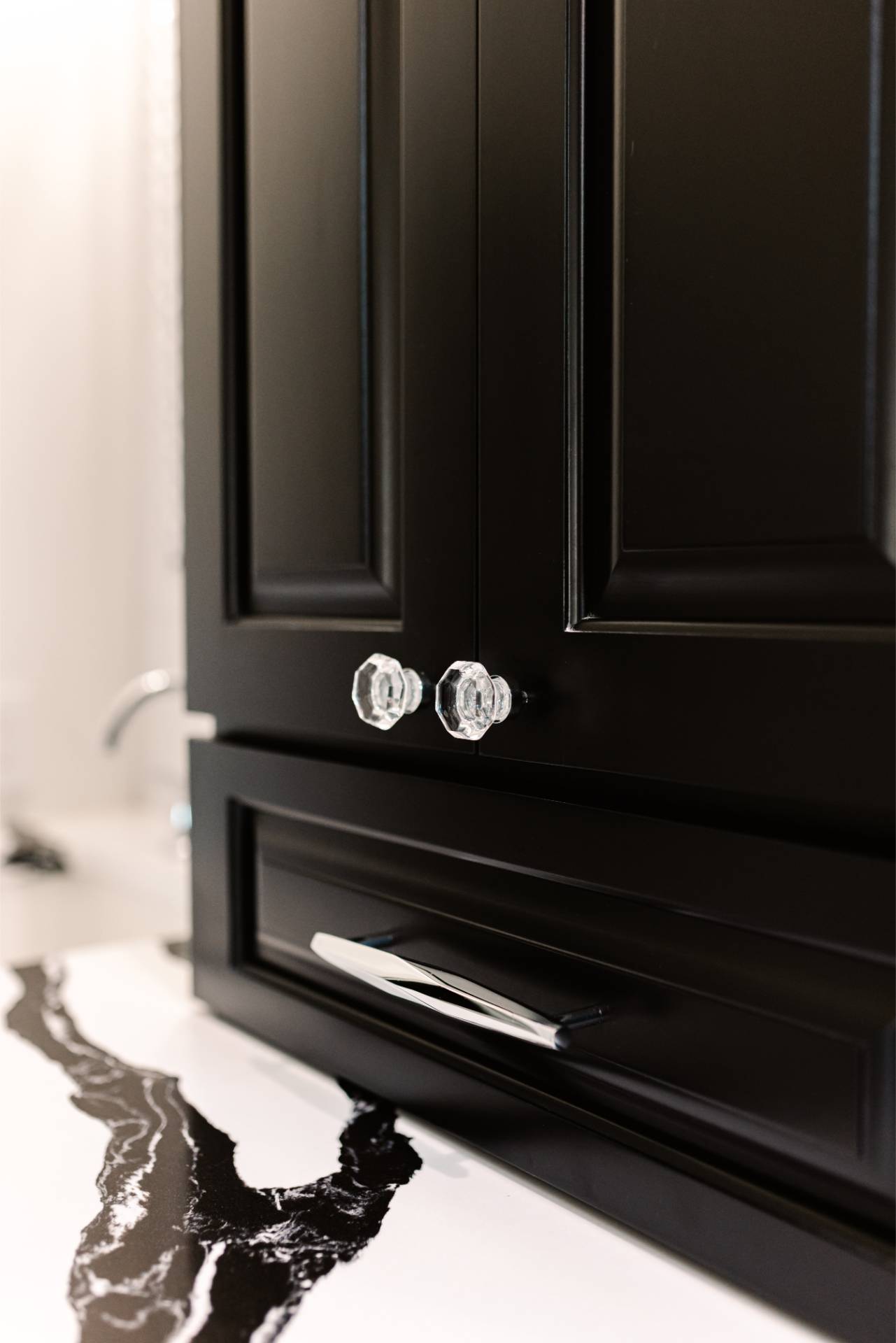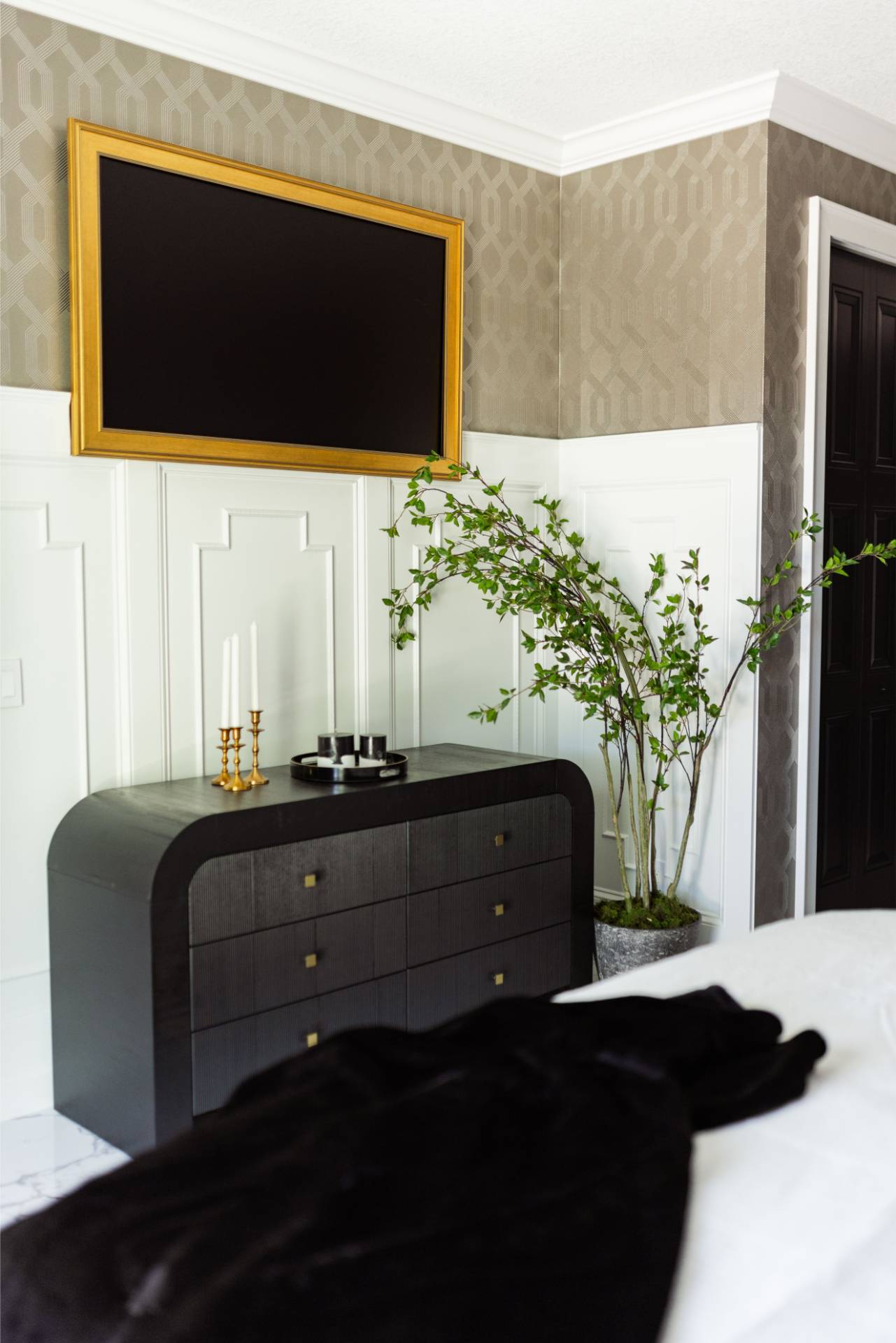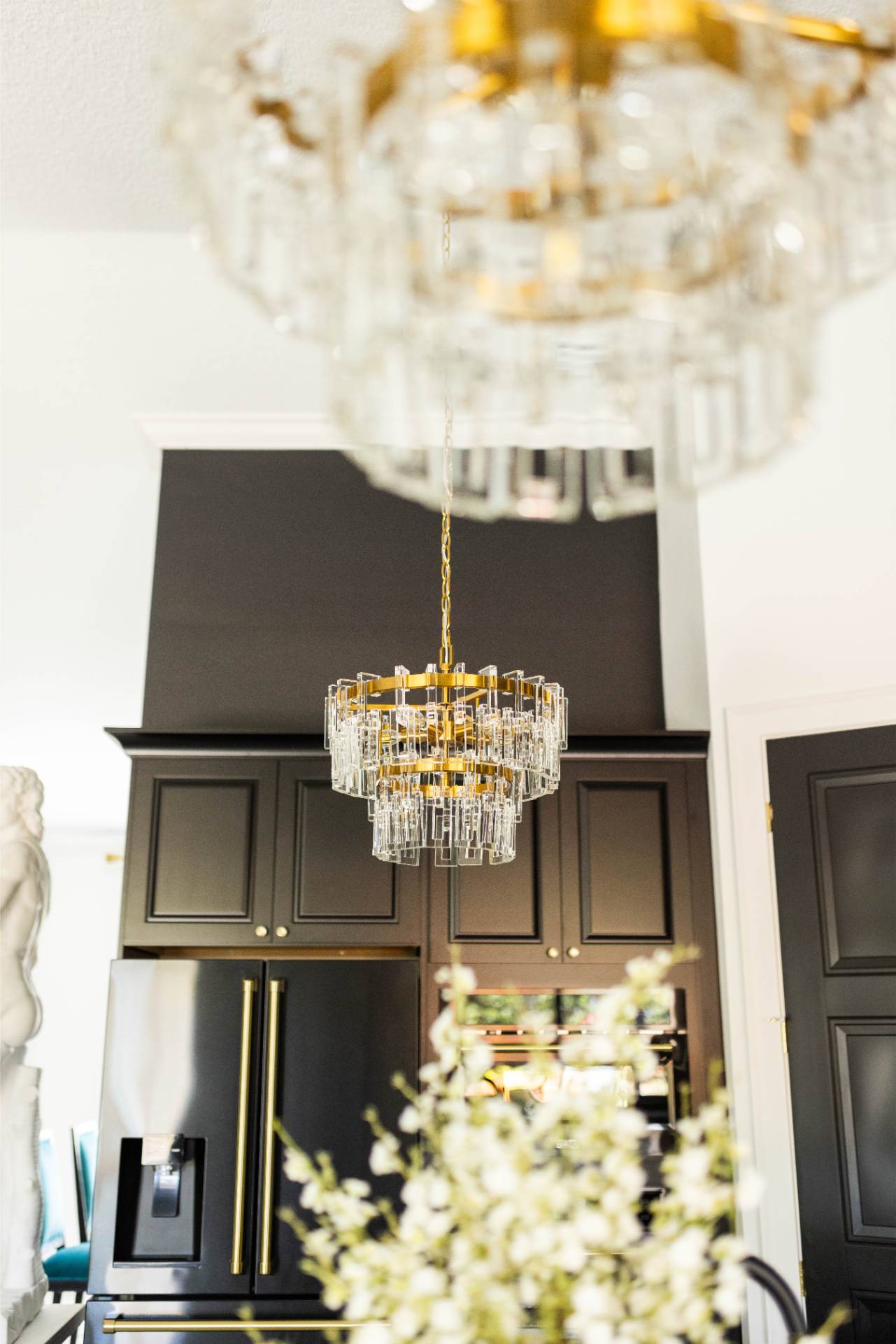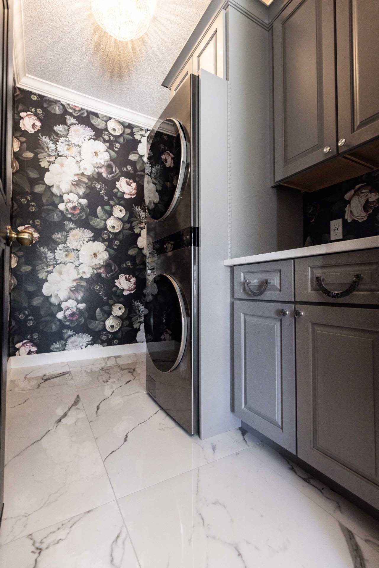 The client’s design vision leaned boldly toward Glam, and the aesthetic shines throughout the home. Think high-gloss finishes, luxe textures, statement lighting, and rich metallic accents—all coming together to create an elevated, sophisticated atmosphere.