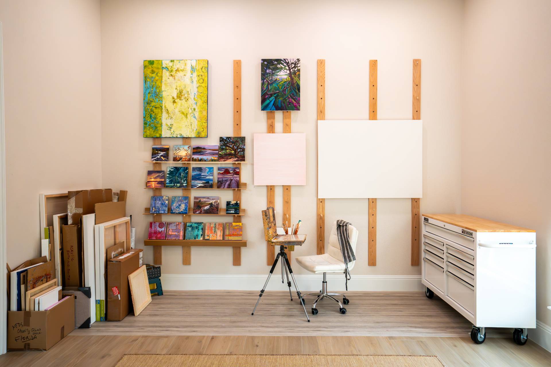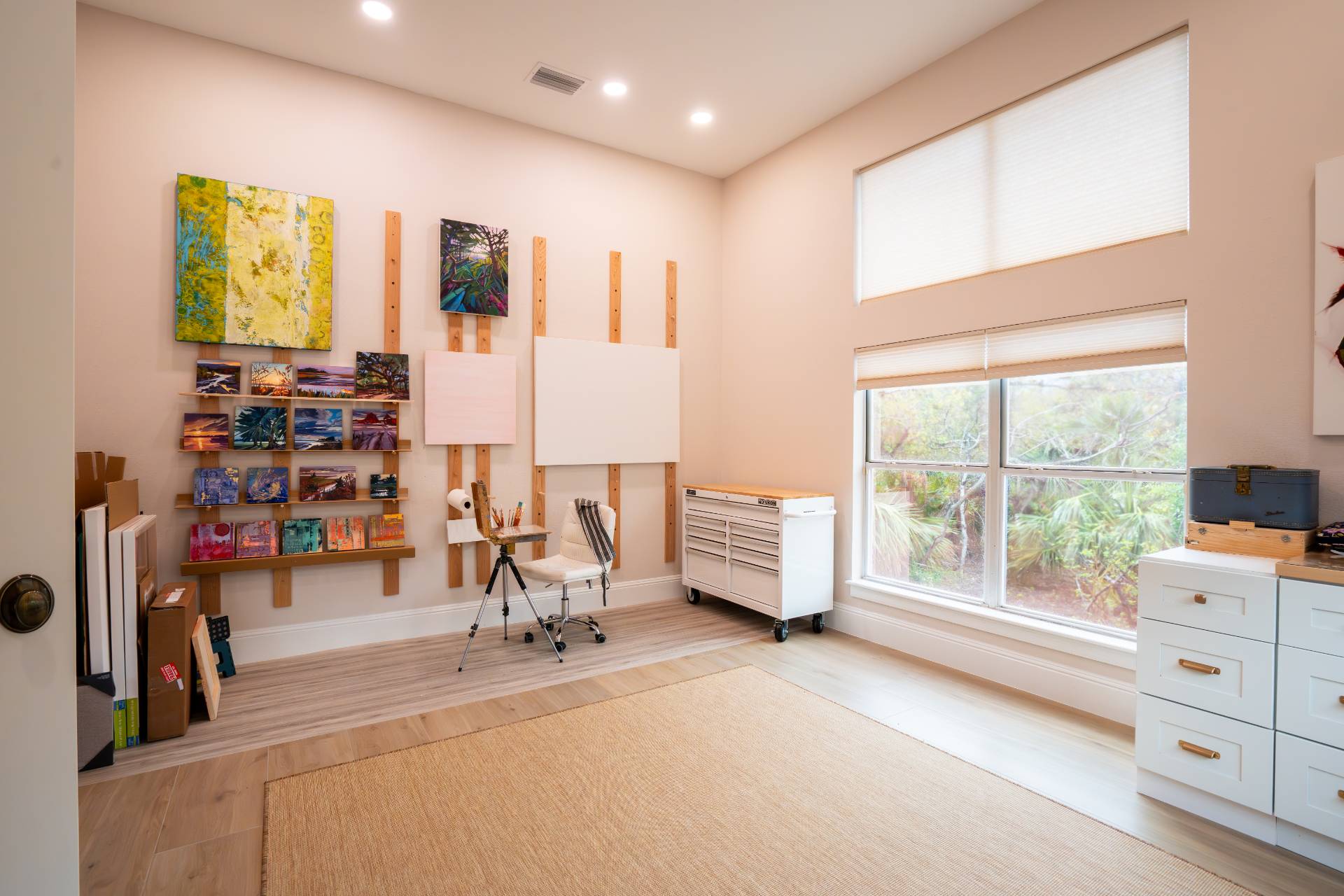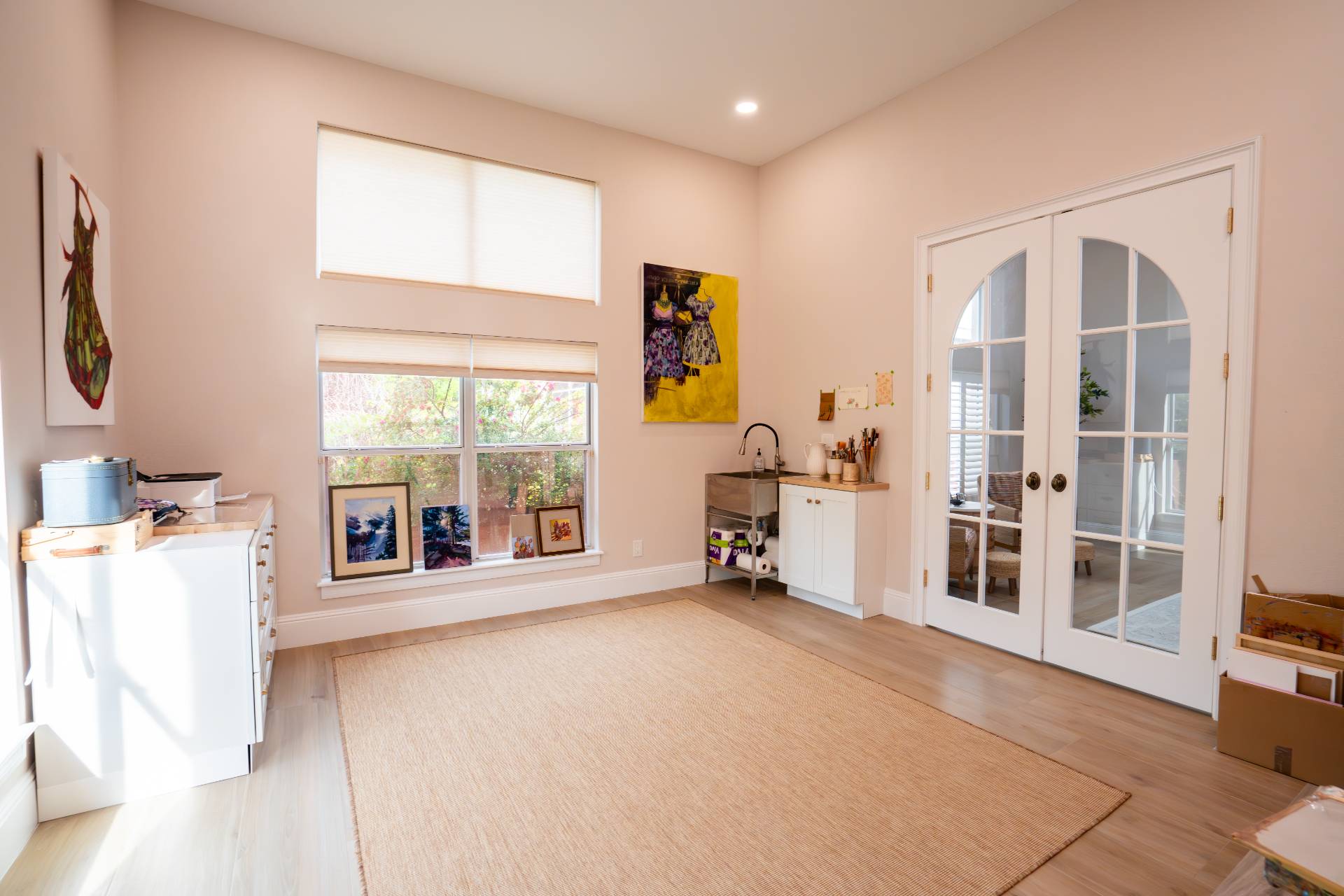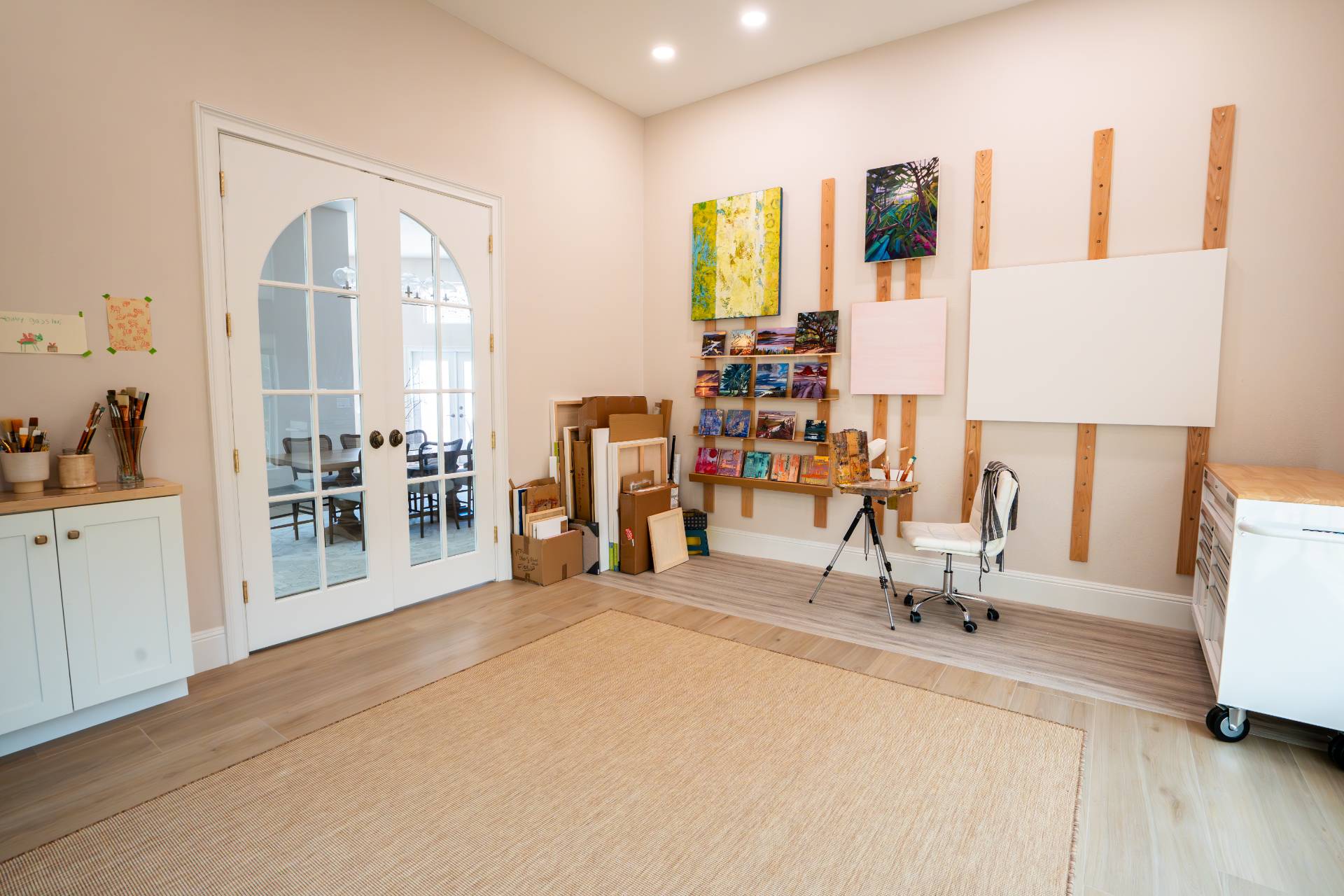 We also created the art studio of our client’s dreams—she’s an artist, and the space features a stunning custom door entrance that sets the tone for creativity and inspiration.